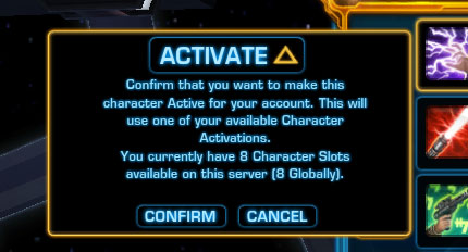 First thing you’ll need to do is pick which characters to activate. Click on the yellow triangle to get a dialog box that will ask you to confirm that this is the character you want. Make sure to pick the character that has all your unlocks! If you have already used any extra character slot unlocks, you will be able to activate all your intended characters now. Otherwise you can activate six now and you’ll have to activate the rest later.